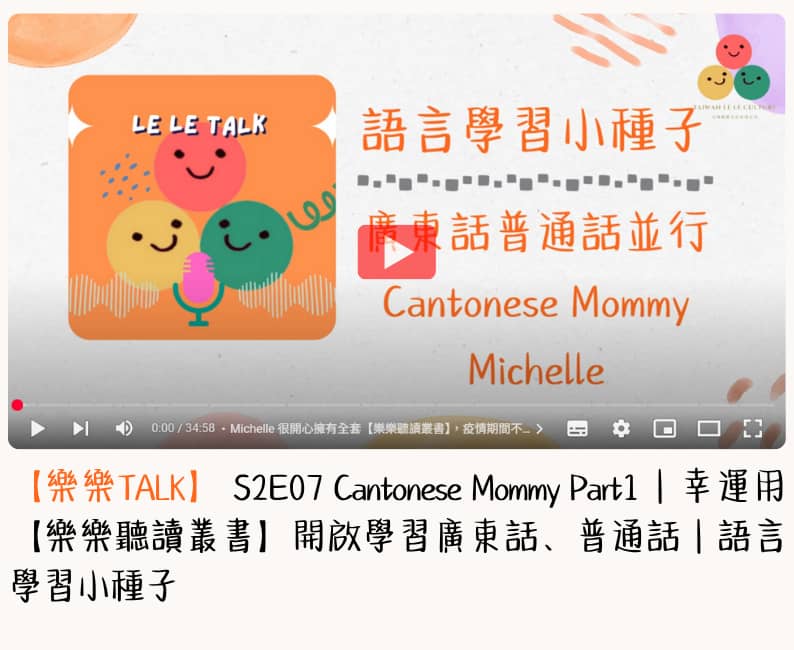這一集《樂樂Talk》的特別來賓,是知名部落客 Michelle,也就是大家熟悉的「Cantonese Mommy」。Michelle 出生於香港,在美國長大,目前定居紐約市。作為兩個孩子的媽媽,她與丈夫一直致力於為孩子保留母語及文化的傳承。 為了讓孩子們能自然習得廣東話與繁體中文,Michelle 付出了許多心力。如今,她的兩個孩子不僅能說一口流利的廣東話,更能閱讀繁體中文書籍,展現出令人欣喜的語文能力。 在疫情期間,Michelle 運用樂樂閱讀系統的 300 本圖書與相關的親子社群,為孩子奠定了扎實的中文基礎。她透過親子共讀、手作活動、以及參與樂樂家庭共讀計畫,營造豐富的中文學習環境。 Michelle 在訪談當中,為家長們提供了許多寶貴的學習經驗及建議,也展現了語言和文化在日常生活中如何自然融入家庭教養。這絕對是不容錯過的一集樂樂Talk,馬上來聽聽她的分享吧! 點擊下方播放鍵► |